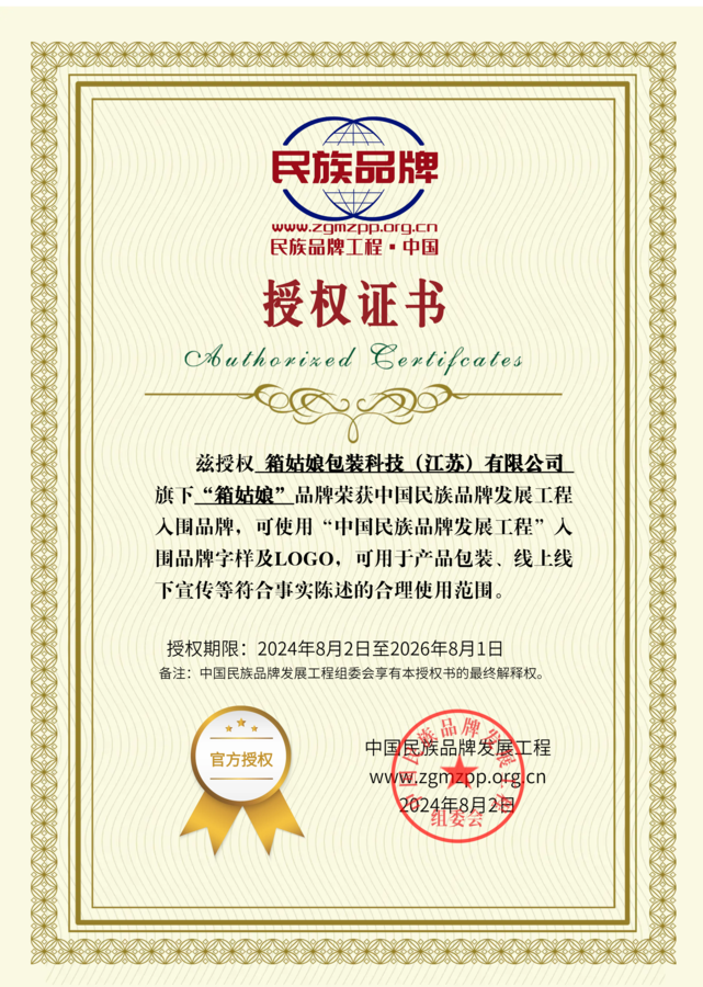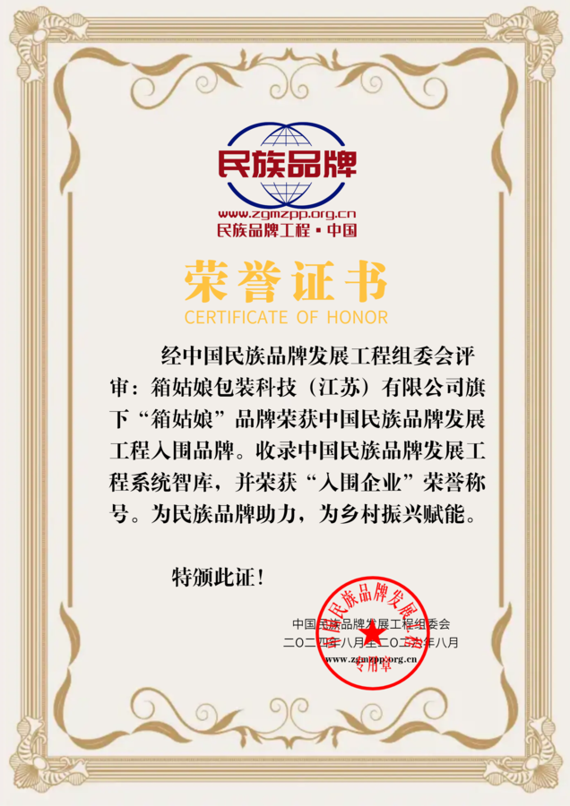 经过中国民族品牌发展工程组委会专家评审,箱姑娘包装科技(江苏)有限公司旗下的“箱姑娘”品牌荣获中国民族品牌发展工程入围品牌。这一荣誉不仅是对箱姑娘品牌价值的高度肯定,也是对其在推动中国品牌国际化进程中所作贡献的认可。