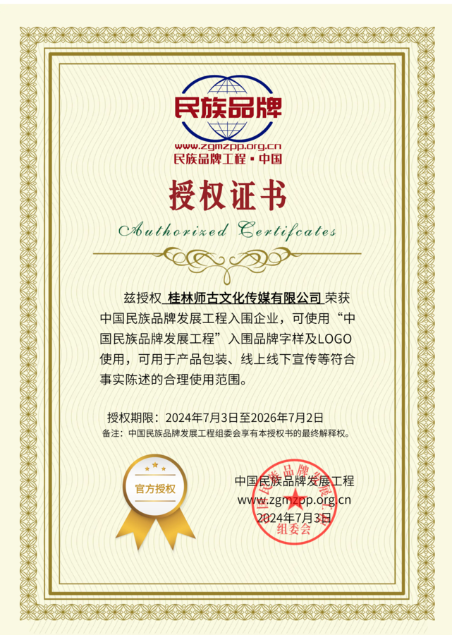 中国民族品牌发展工程组委会宣布,桂林师古文化传媒有限公司凭借其卓越的品牌影响力及深厚的文化底蕴,成功荣膺“中国民族品牌发展工程入围企业”。这一荣誉不仅是对桂林师古文化传媒在推动民族文化传承与创新方面所作贡献的高度认可,更是对其在塑造民族品牌形象、弘扬中国品牌核心价值方面所展现出的卓越实力的肯定。
