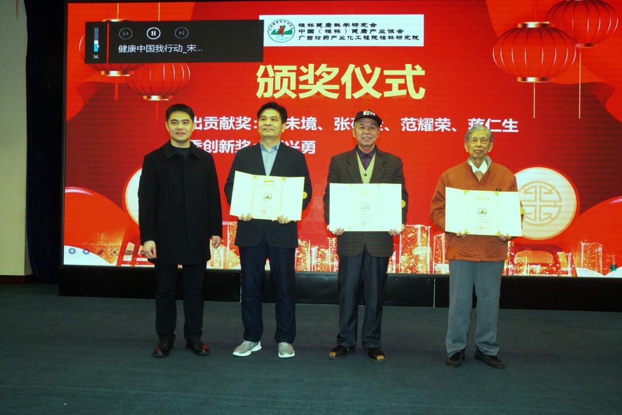 桂林市民政局副局长李俊首先为桂林健康桂林健康科学研究会名誉会长、首任会长王未境,广西师范大学前校长、著名的古典文学专家、国学大师、桂林健康科学研究会总顾问张葆全,桂林健康科学研究会名誉会长范耀荣,重庆智飞生物、桂林健康科学研究会灌江生态论坛理事会荣誉会长蒋仁生,颁发了桂林健康科学研究会杰出贡献奖。并为桂林旅游学院教授、桂林健康科学研究会副会长谭兴勇颁发了桂林健康科学研究会优秀创新奖。