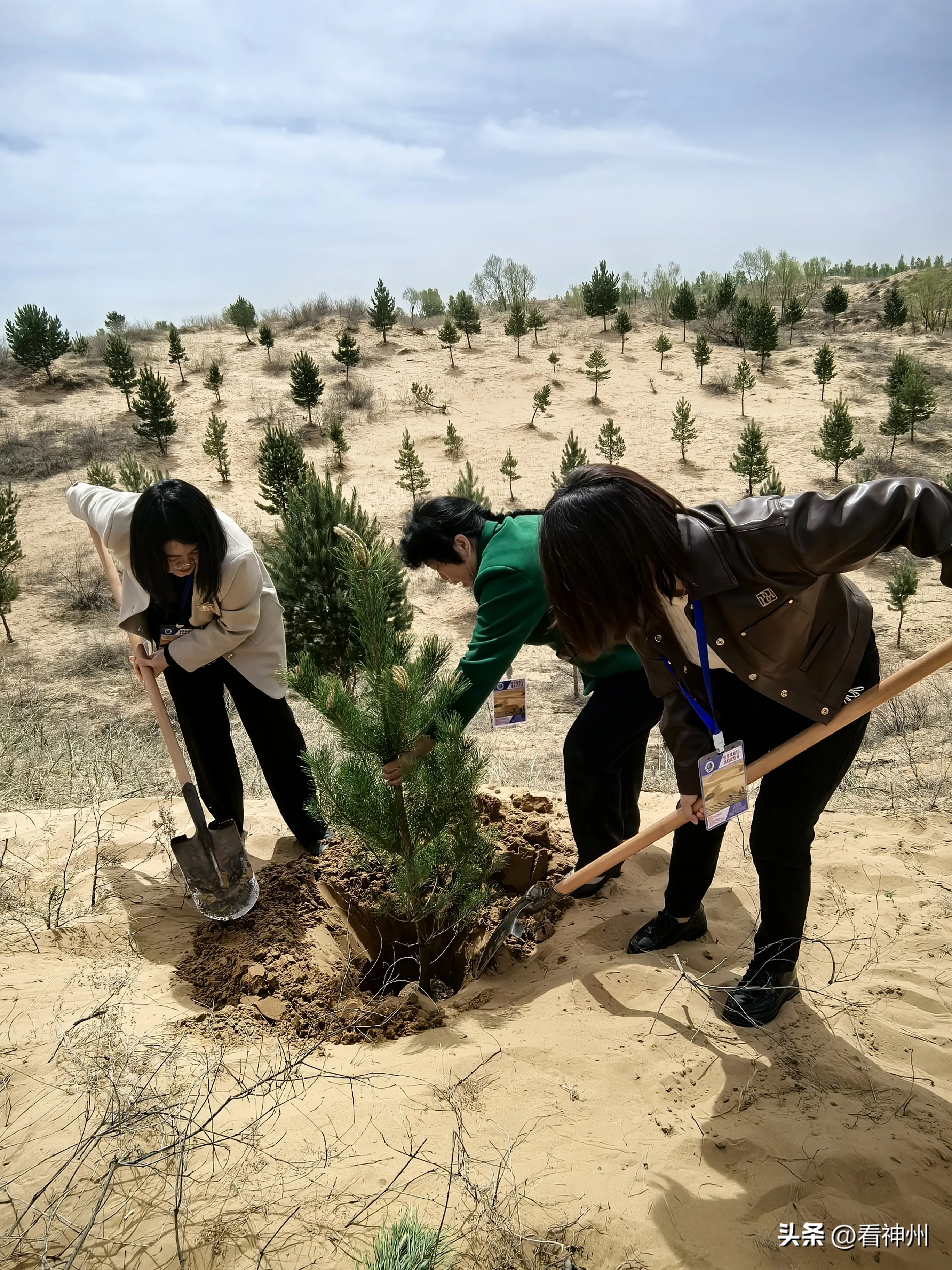 志愿者们购买树苗走进沙漠腹地播绿